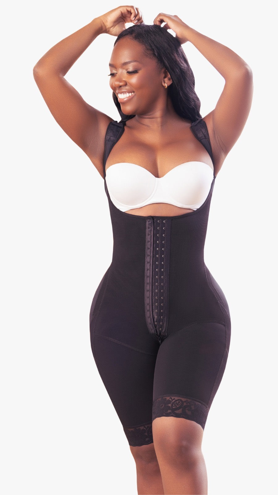 Faja elaborada en tela powernet, alta compresión, 3 líneas de broches al frente, para soporte total, cremallera perineal, espalda cubierta, broches en los hombros para mayor ajuste, levanta glúteos, blondas en piernas con bandas de silicona para que no se enrolle.
