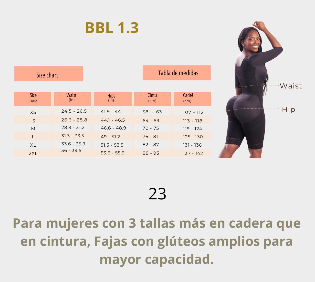 Para mujeres con 3 tallas más encadera que en cintura, Fajas con glúteos amplios para mayor capacidad.